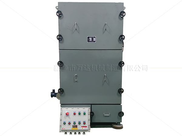 單機布袋除塵器屬于機械抖動除塵器,其基本結構由風機、過濾器和集塵器三個部分組成,各部件都安裝在一個立式框架內(nèi),鋼板殼體,烘漆防銹,運行可靠,使用方便。風機采用離心風機,風量大,風壓高,并采用消聲措施,噪音小。過濾器采用扁布袋組,每個布袋內(nèi)裝有彈簧鋼絲網(wǎng),過濾效果好。清灰機構采用電動機帶動偏心輪、連桿使布袋抖動而沾在濾袋表面的粉塵。此除塵器設有檢修門,方便檢修和換袋。